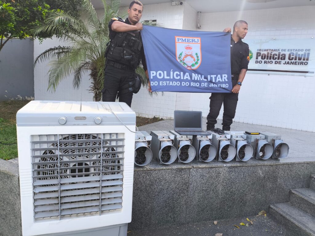 No local, foi identificada uma ligação elétrica irregular, feita diretamente do poste da rede pública com cabos de alta espessura. Pela janela, os policiais avistaram diversos equipamentos eletrônicos usados para mineração de moedas digitais. Após perícia, foram apreendidos: 1 climatizador de ar; 8 CPUs de computador; 1 notebook; e 2 switches de rede.